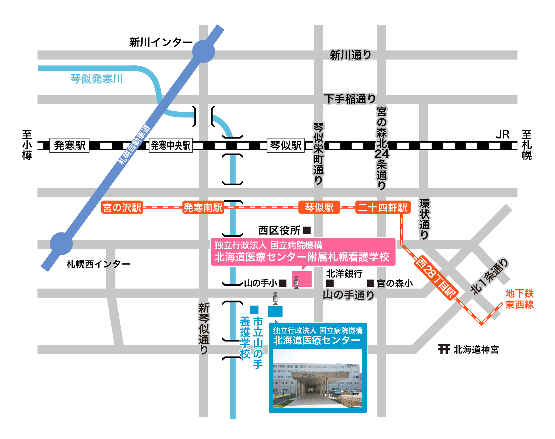 - 地下鉄東西線 琴似駅バスターミナルより 琴43番西野中洲橋線にて北海道医療センター前下車